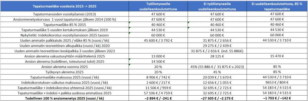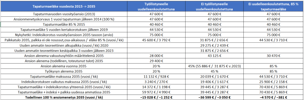 Olisin voinut lisätä taulukkoon vielä tuottamuksellisen työtapaturman tai ammattitaudin. Tällöin vammautuneen/sairastuneen ei tarvitse tapella vakuutusyhtiön kanssa korvauksista, koska vahingonkorvauslakiin vedoten hän voi vaatia kaikkia tapaturmalain mukaisia korvauksia + tilapäisen haitan/kivun ja säryn korvauksia vahingon aiheuttajalta eli työnantajalta. Mikäli tapaturmavakuutus korvaa lakisääteiset korvaukset, voi vahingoittunut tuottamukseen (huolimattomuus riittää tuottamukseen, ei siis vaadita tahallisuutta) vaatia esim. mm. 85 %:lla tapaturmaeläkkeellä ollessaan puuttuvan 15 % työnantajalta. Ja kuten taulukko osoittaa, on kiistatonta etteikö ansionalenemaa todistettavasti tule, joten vakuutusyhtiön maksamattomia ansionalenakorvauksia voi vaatia vakuutuksen ottajalta eli työnantajalta aina niitä aiheutuessa lopun elämää.